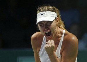 Maria Sharapova of Russia celebrates a point against Agnieszka Radwanska of Poland during their WTA Finals singles tennis match at the Singapore Indoor Stadium October 24, 2014. REUTERS/Edgar Su