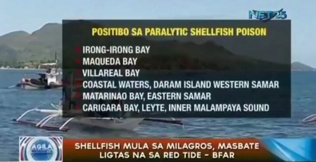 But the areas in Western Samar (Irong-Irong Bay, Maqueda Bay, Villareal Bay, and Daram Island), Eastern Samar (Matarinao Bay), Leyte (Carigara Bay), Palawan (Inner Malampaya Sound, Taytay, Puerto Princesa Bay, Puerto Princesa City) and the coastal waters of Mandaon in Masbate remain contaminated with paralytic shellfish toxins.