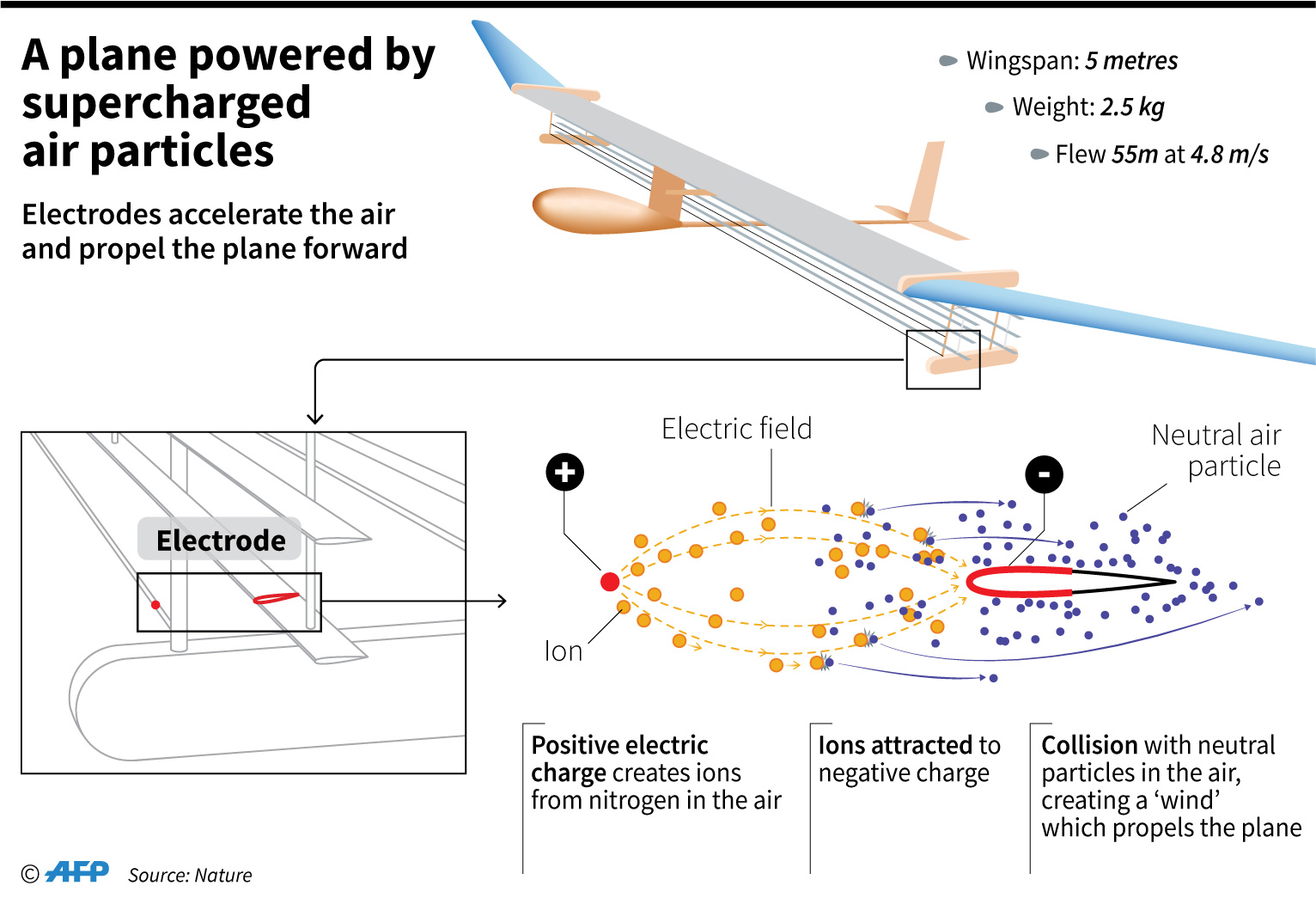 At the plane’s rear are rows of aerofoils set to -20,000v. The ions automatically move from a positive to negative charge, dragging with them air particles that create the so-called “ionic wind” to provide the aircraft with lift.