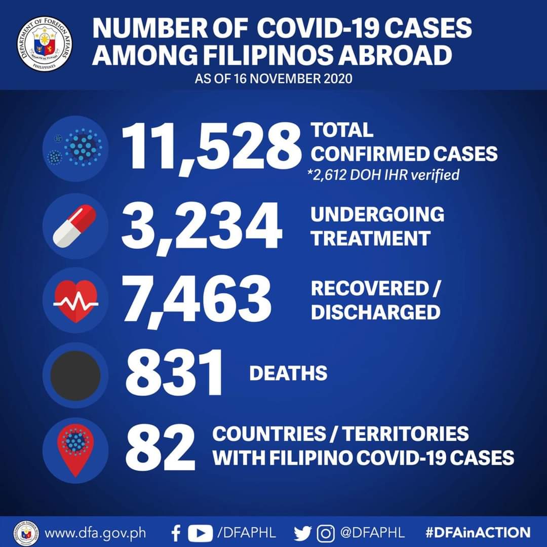 The Department of Foreign Affairs said with the additional cases, the tally rose to 11528.