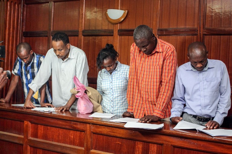 (L-R) Osman Ibrahim, Guleid Abdihakim, Gladys Kaari Justus, Oliver Muthee and Joel Nganga, six suspects arraigned in court in connection with an Islamist attack on a Nairobi hotel complex that left 21 dead, stand in the courthouse of Nairobi, on January 18, 2019. – A magistrate granted a request from the prosecution to detain the four men and one woman for 30 days while investigations continue. The suspects are accused of “possible involvement” in the almost 20-hour siege of the DusitD2 hotel and office complex by a suicide bomber and four gunmen who were killed by security forces, a court document said. (Photo by STRINGER / AFP)