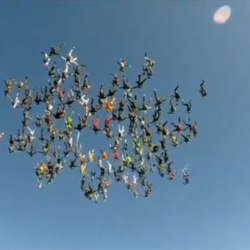 164 skydivers built the largest ever vertical skydiving formation, a giant flower, while some traveled at speeds up to 240 mph.