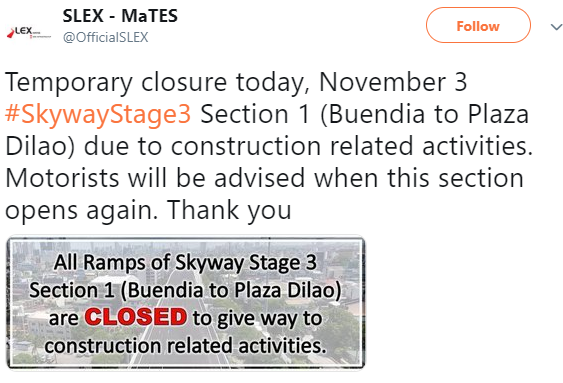 The Manila Toll Expressway Systems Inc., South Luzon Expressway operator, said in a Tweet that the temporary closure was due to “construction-related activities.”
