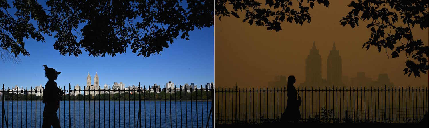 people walk in Central Park as smoke from wildfires in Canada cause hazy conditions in New York City on June 7, 2023.. Smoke from Canadian wildfires have shrouded the US East Coast in a record-breaking smog, forcing cities to issue air pollution warnings and thousands of Canadians to evacuate their homes. The devastating fires have displaced more than 20,000 people and scorched about 3.8 million hectares (9,390,005 acres) of land. Prime Minister Justin Trudeau described this wildfire season as the country’s worst ever. (Photo by TIMOTHY A. CLARY / AFP)