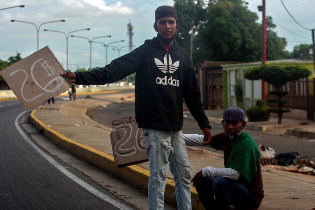 In a rundown area of Maracaibo, contraband Colombian gas is sold openly on the roadside, where vendors wave cardboard signs with prices. A 20-liter jerrycan can run from $25 to $30.