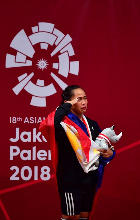 Hidilyn Diaz of Philippines salutes at the podium during the victory ceremony for the women’s 53kg weightlifting event during the 2018 Asian Games in Jakarta on August 21, 2018. / AFP PHOTO / MONEY SHARMA