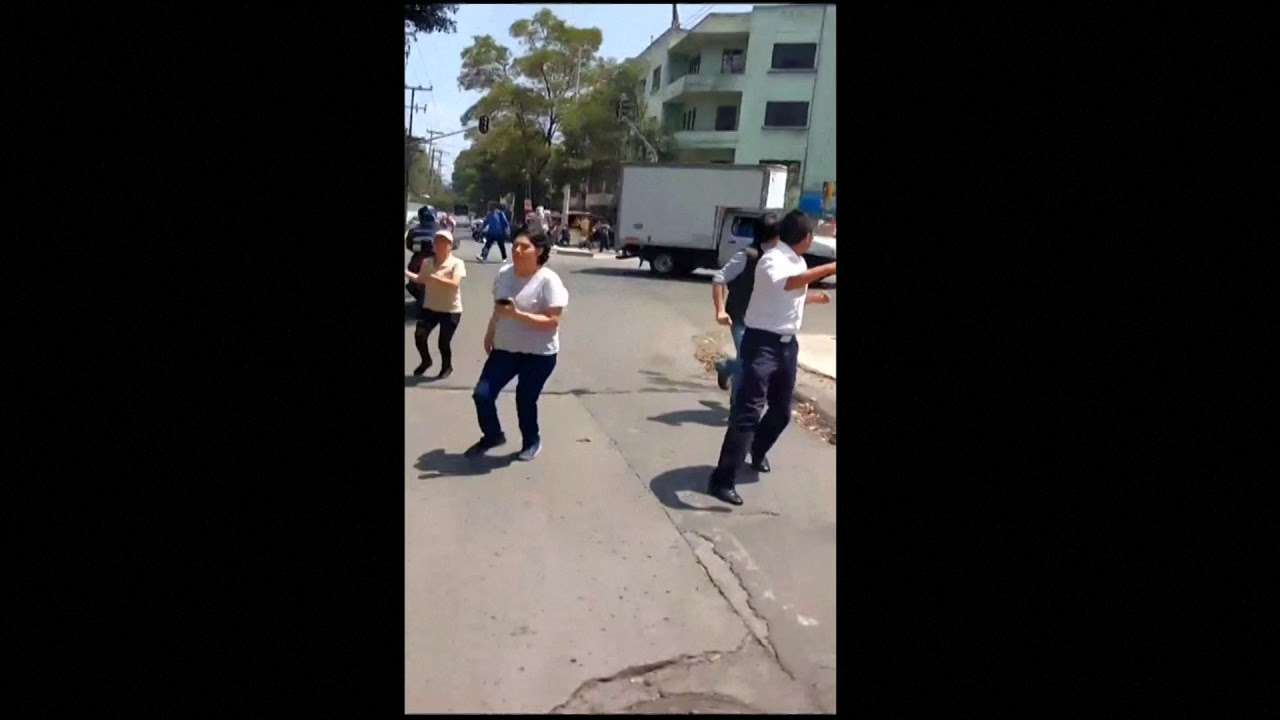 Another post, from Facebook, shows students running from Mexico City’s Monterrey Institute of Technology and Higher Education, while parts of a different building collapse behind them.