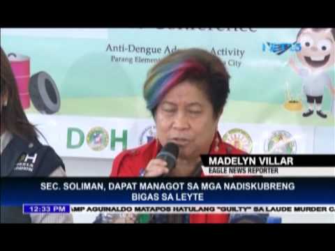 Militant representatives said that Social Welfare and Development Secretary Dinky Soliman should be held liable after several sacks of rice were discovered in Leyte. It is believed that said rice was for the Yolanda victims.