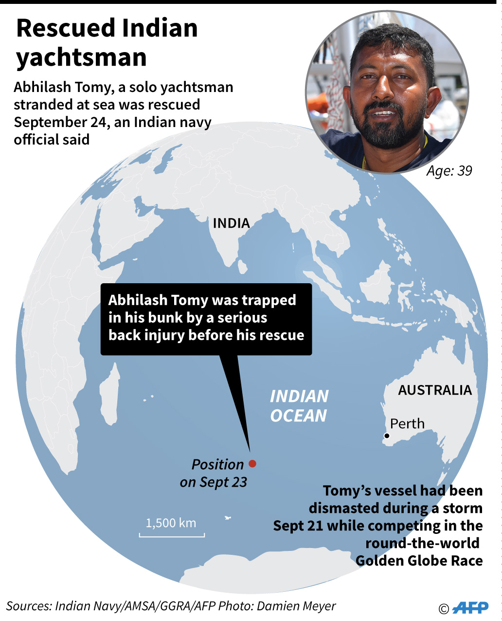 Abhilash Tomy, a competitor in the Golden Globe round-the-world race, was badly injured when his vessel was damaged in a storm on Friday 3,500 kilometers (2,200 miles) from western Australia.