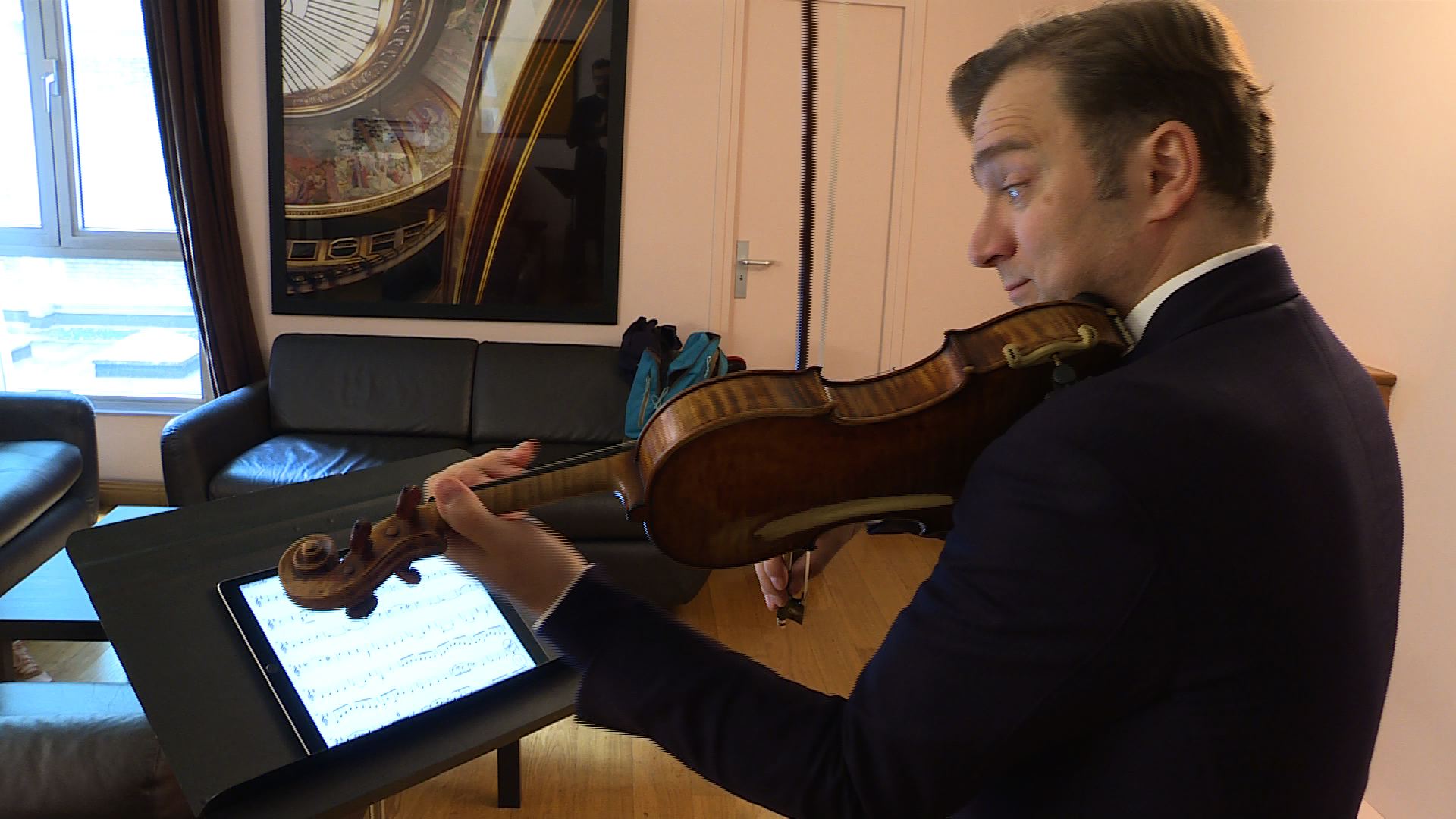 Taking Ravel’s string quartet, he clicked on the violin symbol to eliminate the sound of the part, before accompanying the piece with his own instrument.