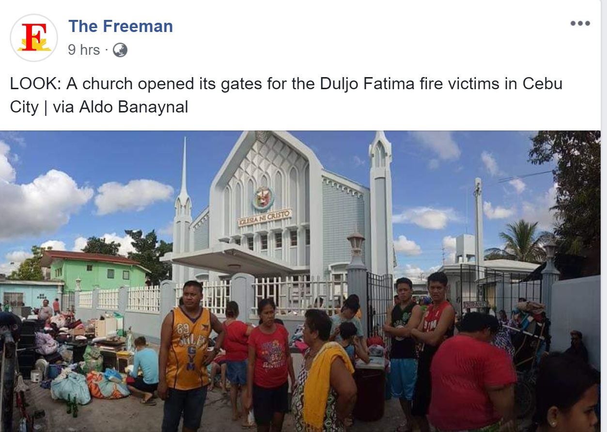 The Freeman, in a Facebook post, also reported that an Iglesia Ni Cristo house of worship opened its doors to affected residents of the Duljo Fatima fire in Cebu City.