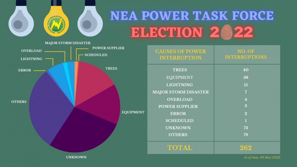 The Manila Electric Company (MERALCO), the largest power distributor in the country, reported on the 20 power outages that happened on election day, while the National Electrification Administration (NEA) reported a total of 262 power interruptions since Sunday evening, from 7 p.m. of May 8 until 4 a.m. today, May 9.