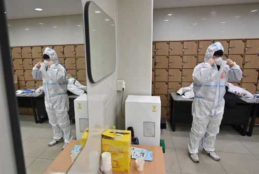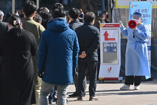 A health worker (R) wearing protective gear guides visitors at a Covid-19 coronavirus testing centre in Seoul on March 2, 2022, after South Korea’s daily infections rose sharply to hit new high of over 200,000. (Photo by Jung Yeon-je / AFP)