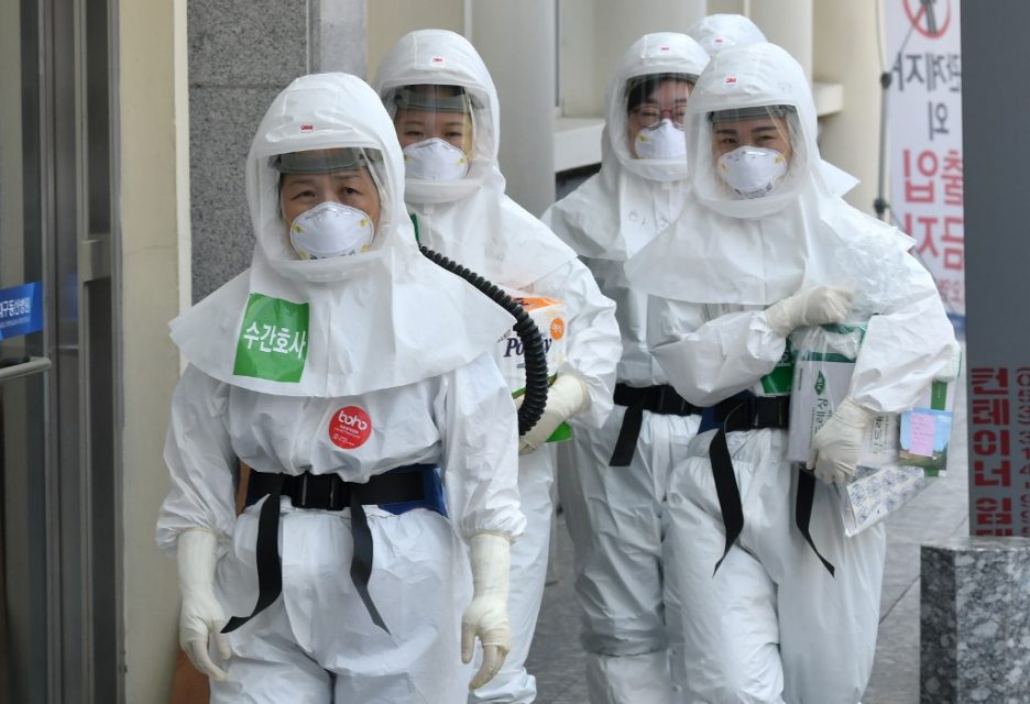 South Korean nurses wearing protective gear arrive for their shift to care for patients infected with the COVID-19 coronavirus at Keimyung University Daegu Dongsan Hospital in Daegu on April 29, 2020. – South Korea once had the largest outbreak outside China, where the disease first emerged, but appears to have brought it under control with an extensive “trace, test and treat” program. (Photo by Jung Yeon-je / AFP)