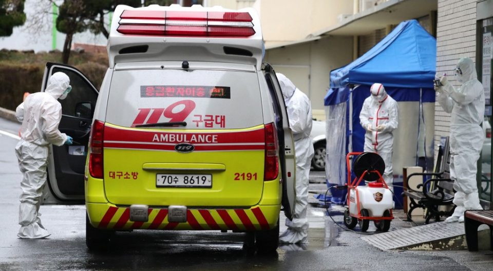 A medical worker sprays disinfectant into an ambulance at a hospital where patients infected with the COVID-19 coronavirus are being treated, in the southeastern city of Daegu on February 25, 2020. – The novel coronavirus outbreak in South Korea is “very grave”, President Moon Jae-in said on February 25 as he visited its epicenter and the country’s total number of cases approached 1,000. (Photo by – / YONHAP / AFP)