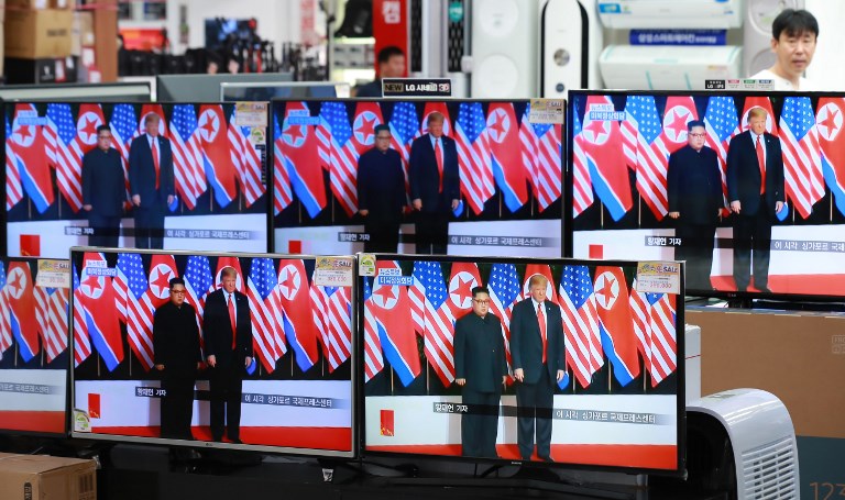 Donald Trump and Kim Jong Un have become on June 12 the first sitting US and North Korean leaders to meet, shake hands and negotiate to end a decades-old nuclear stand-off. / AFP PHOTO / YONHAP /