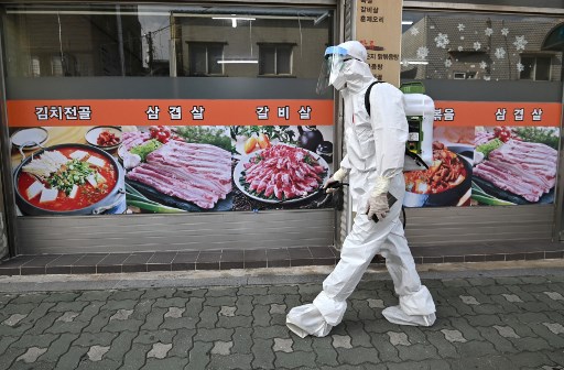 A health official wearing protective gear sprays disinfectant on the street near the Sarang Jeil Church, a new coronavirus infection cluster, in Seoul on August 18, 2020. – South Korea on August 18 ordered nightclubs, museums and buffet restaurants closed and banned large-scale gatherings in and around the capital as a burst of new coronavirus cases sparked fears of a major second wave. (Photo by Jung Yeon-je / AFP)