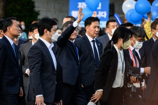(FILES) In this file picture taken on March 10, 2022, South Korea’s new president-elect Yoon Suk Yeol (C) of the main opposition People Power Party gestures to his supporters as he is congratulated outside the party headquarters in Seoul. – Peace with North Korea and a “fair and just” society in the South: outgoing President Moon Jae-in made big promises, but after five years in power, he has failed to deliver, analysts say. (Photo by JUNG YEON-JE / AFP)