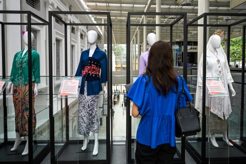 (FILES) In this photo taken on April 5, 2023 a woman looks at a “kebaya”, a traditional outfit worn by women in Southeast Asia, on display at the National Museum in Singapore. Brunei, Indonesia, Malaysia, Singapore and Thailand agreed to jointly nominate the “kebaya” to be inscribed on UNESCO’s list of Intangible Cultural Heritage for 2023. (Photo by Roslan RAHMAN / AFP)