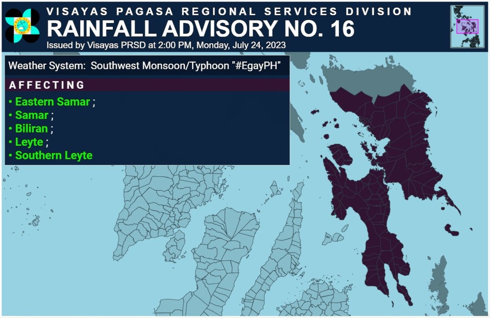 The Philippine Atmospheric, Geophysical, and Astronomical Services Administration (PAGASA) has issued Rainfall Advisory No. 16 for the Visayas PRSD (Regional Services Division) as the region experiences the combined impact of the Southwest Monsoon and Typhoon “#EgayPH.”