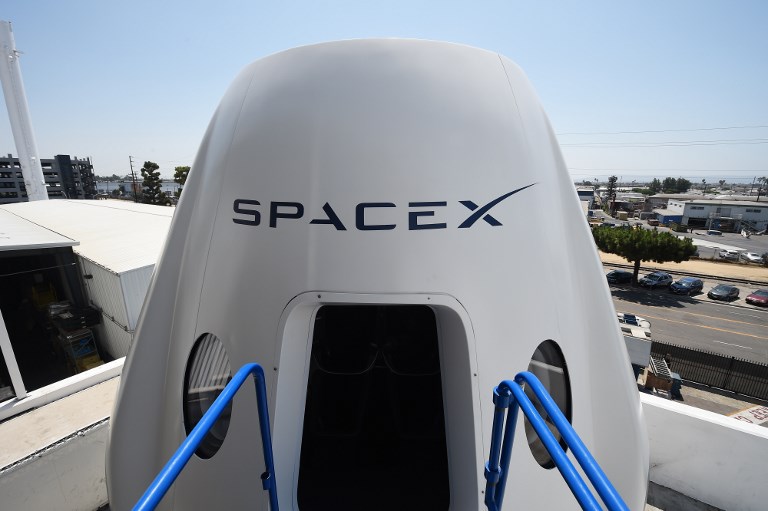 (FILES) In this file photo taken on August 13, 2018 a mock up of the Crew Dragon spacecraft is displayed during a media tour of SpaceX headquarters and rocket factory in Hawthorne, California.