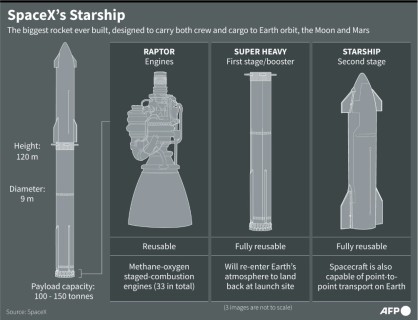 Starship consists of a 164-foot (50-meter) tall spacecraft designed to carry crew and cargo that sits atop a 230-foot tall first-stage Super Heavy booster rocket.