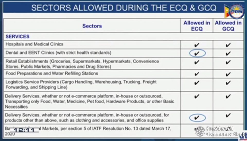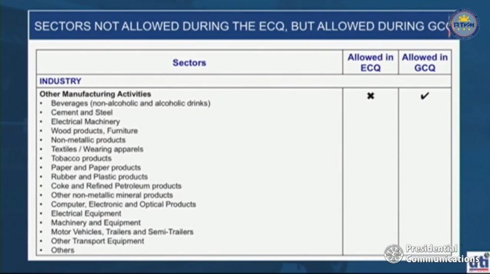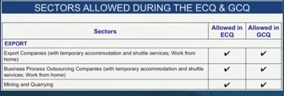 First, here is a list of industries that will be allowed to open under both ECQ and GCQ areas: