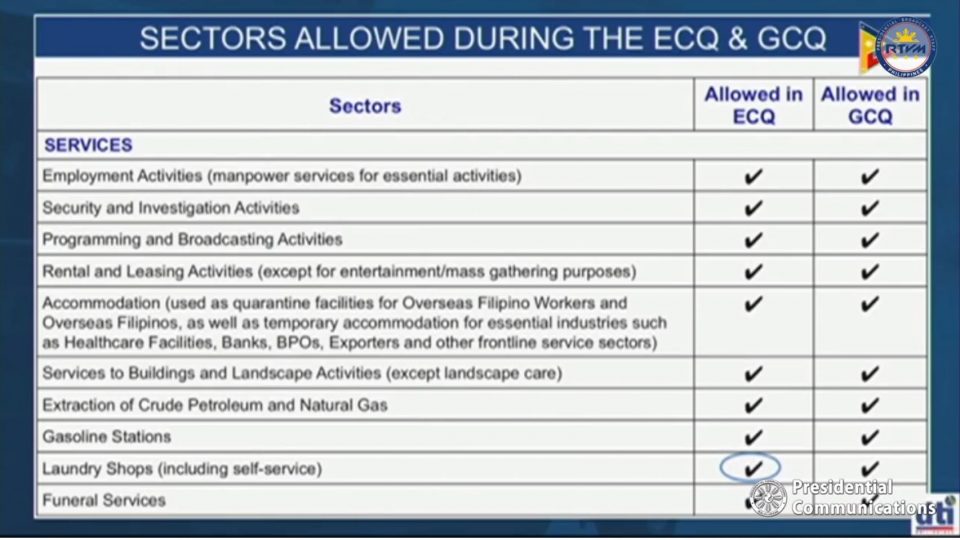 Roque also identified the businesses and services allowed under GCQ, but not for ECQ areas. These are the following: