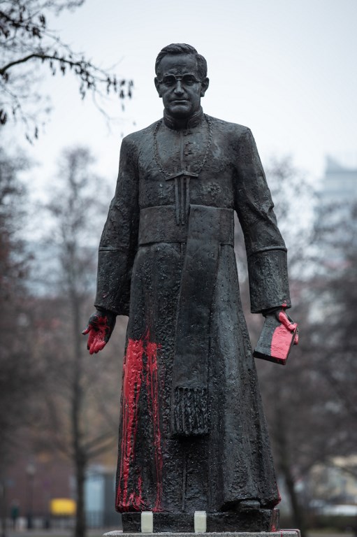 Supporters of the priest, including conservatives and Solidarity union representatives, then restored it to its plinth.