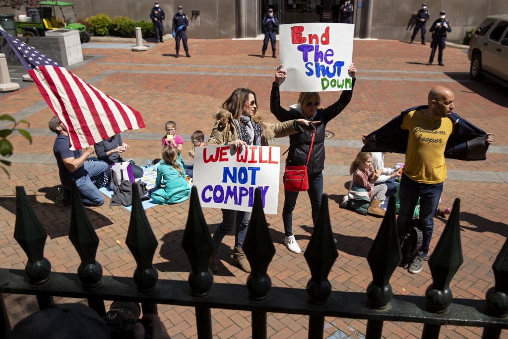 Some 100 protestors took to the streets in the North Carolina city of Raleigh on Tuesday, and about the same number gathered outside the state capitol in Kentucky on Wednesday chanting, “We want to work!”