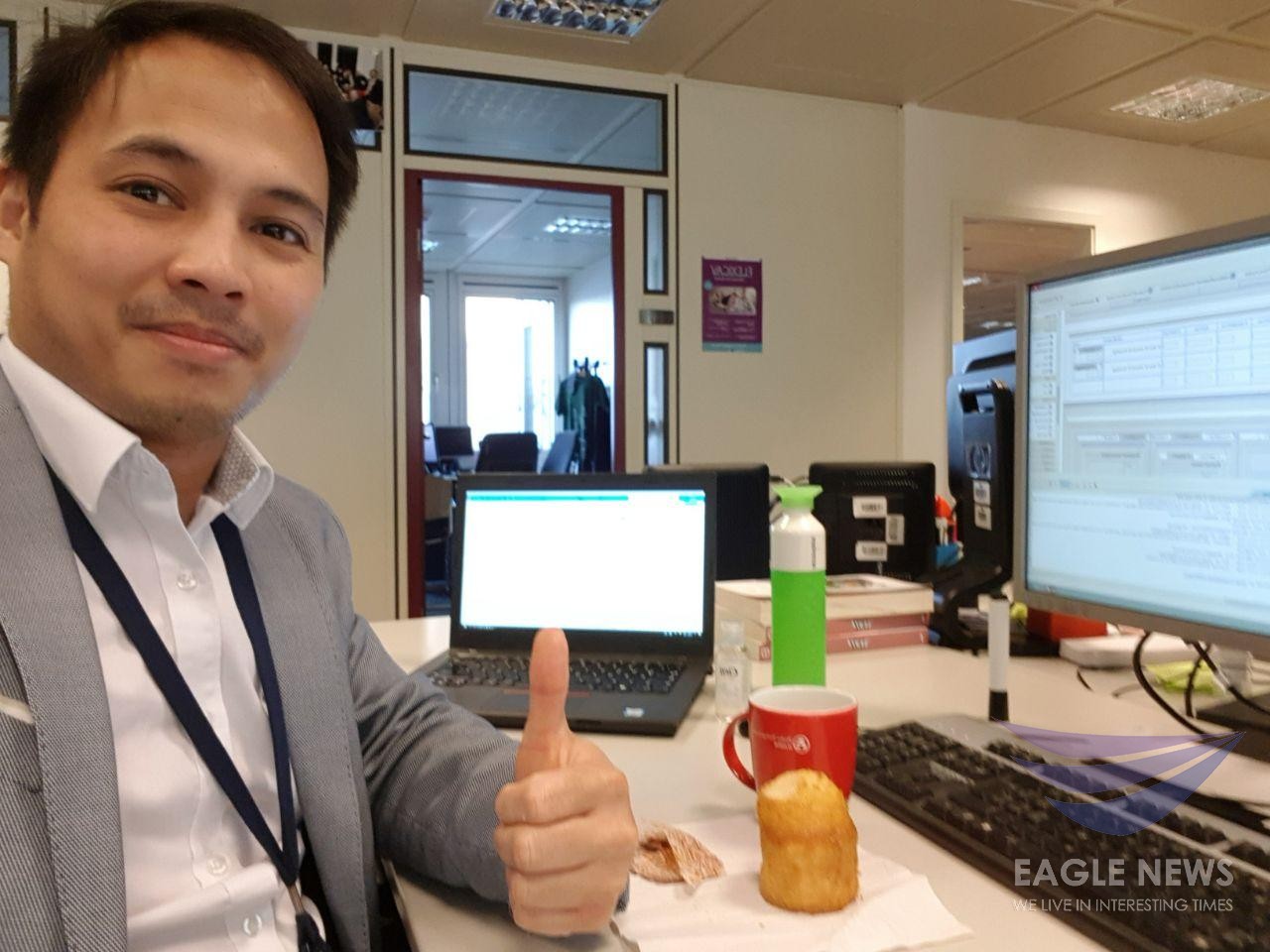 These photos by Amil Lopez, Eagle News Service correspondent in Luxembourg, also showed him having his own packed food inside the office.