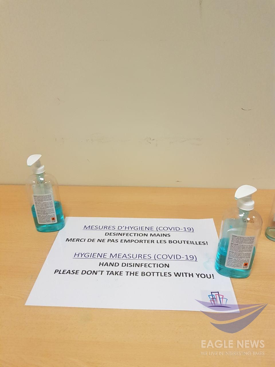 Hand sanitizers are available on a table, complete with a sign that reminds the users: “Don’t take the bottle with you!”