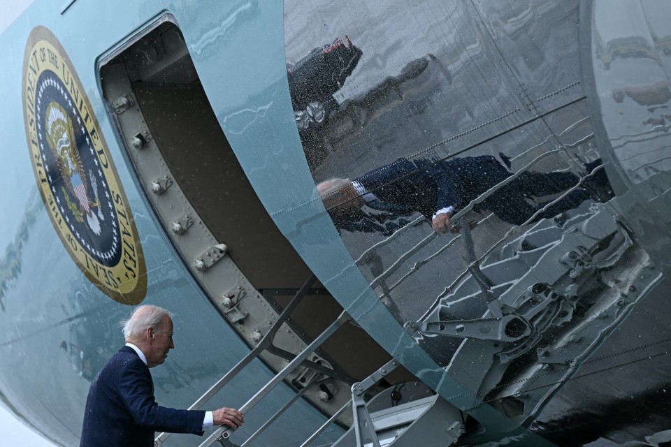 US President Joe Biden boards Air Force One at Ellington Field Joint Reserve Base in Houston, Texas– From grilling Washington power players to getting grilled themselves. Turns out, the press corps on Air Force One have been busy ‘collecting’ souvenirs for years. (Photo by Brendan SMIALOWSKI / AFP)