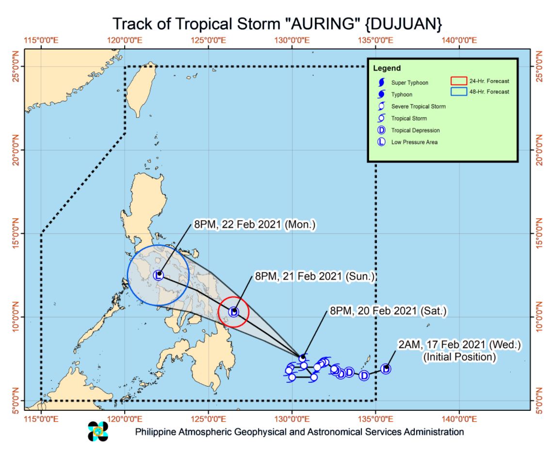 “On the forecast track, ‘AURING’ will likely make landfall over the Dinagat Islands-Eastern Samar (southern portion including Homonhon Island)-Leyte area between tomorrow evening and Monday early morning,” PAGASA said.