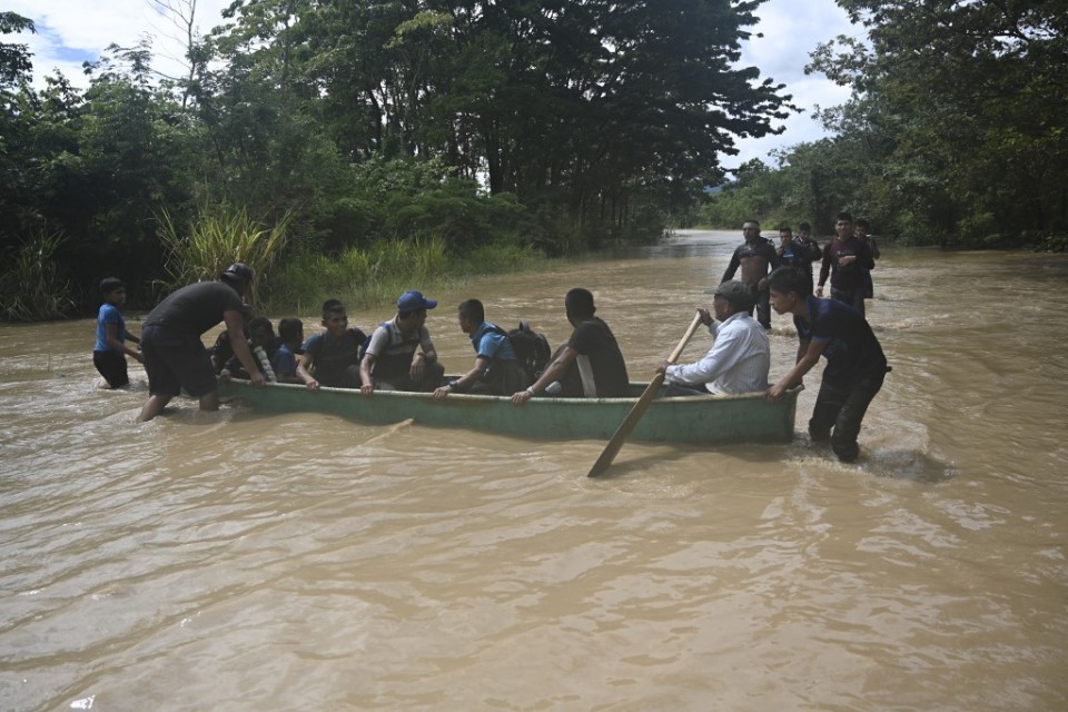People are transported in a boat in a flooded area in Panzos, Alta Verapaz, 220 km north of Guatemala City on November 6, 2020 after the passage of Hurricane Eta -now degraded to a tropical storm. – About 150 people have either died or remain unaccounted for in Guatemala due to mudslides caused by powerful storm Eta, which buried an entire village, President Alejandro Giammattei said Friday. (Photo by Johan ORDONEZ / AFP)