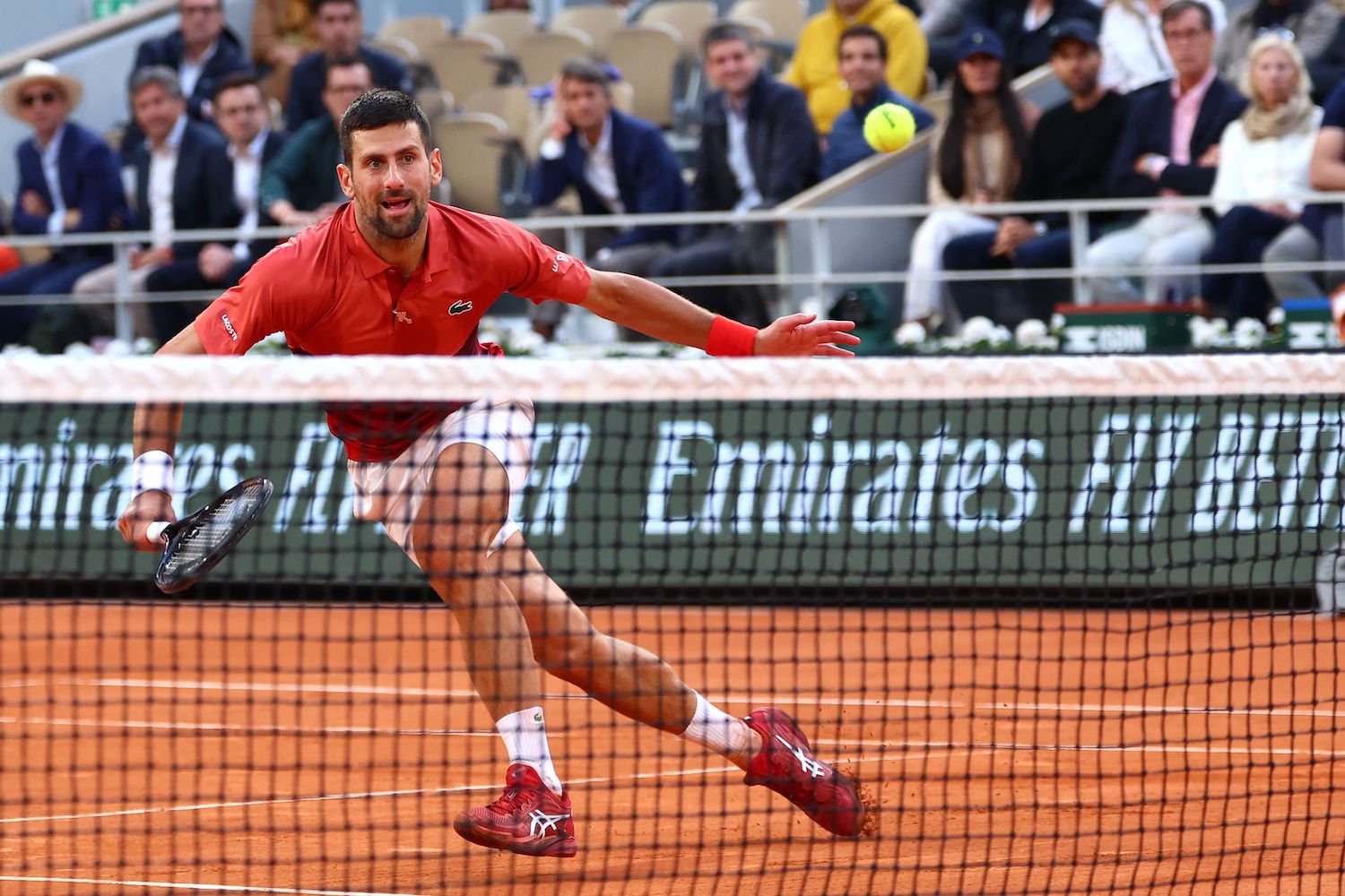 Djokovic was left covered in clay after a nasty tumble, sarcastically saying: “Well done supervisors, ground staff, everyone, the court is not slippery at all.”