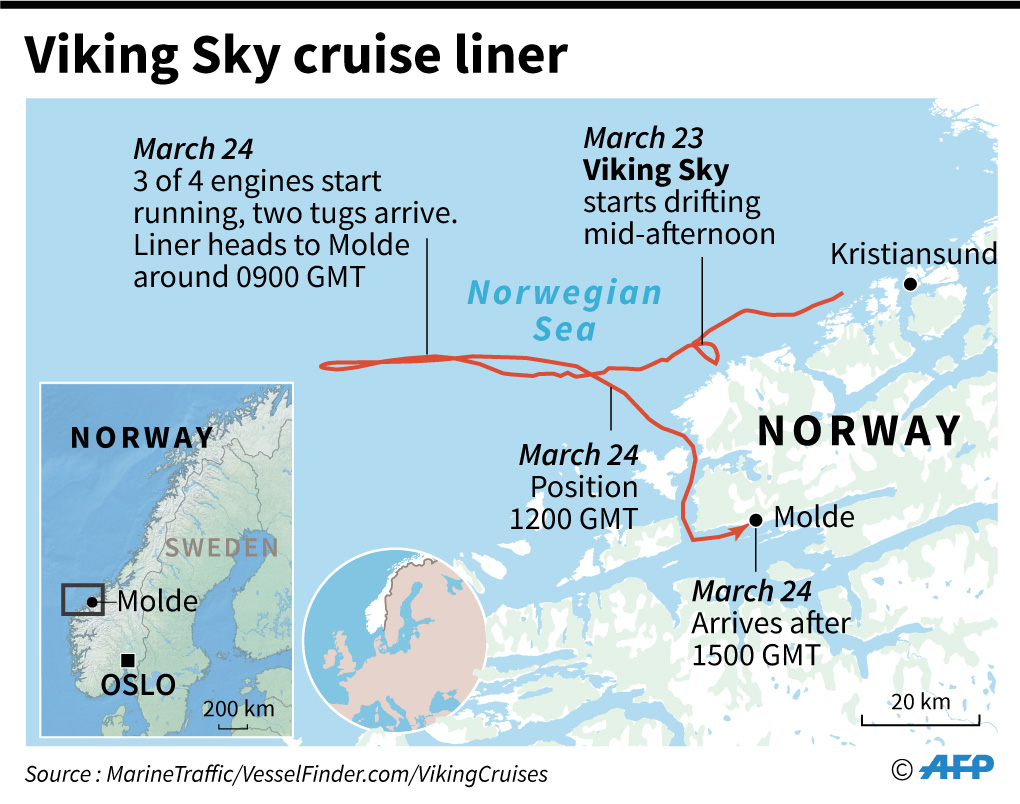 Escorted by tugboats, the Viking Sky arrived in the port of Molde at around 4:15 pm (1515 GMT), television images showed. Nearly a third of its 1,373 passengers and crew had already been airlifted off the ship.