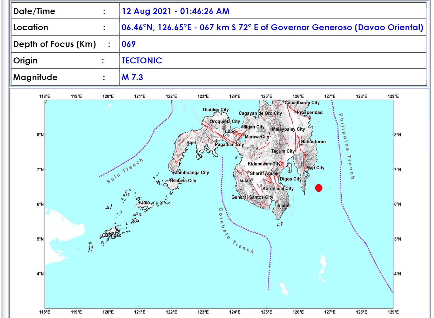 (Eagle News) – A strong magnitude 7.3 quake rocked waters off the coast of Davao Oriental province at 1:46 a.m. on Thursday, Aug. 12, PHIVOLCS said.