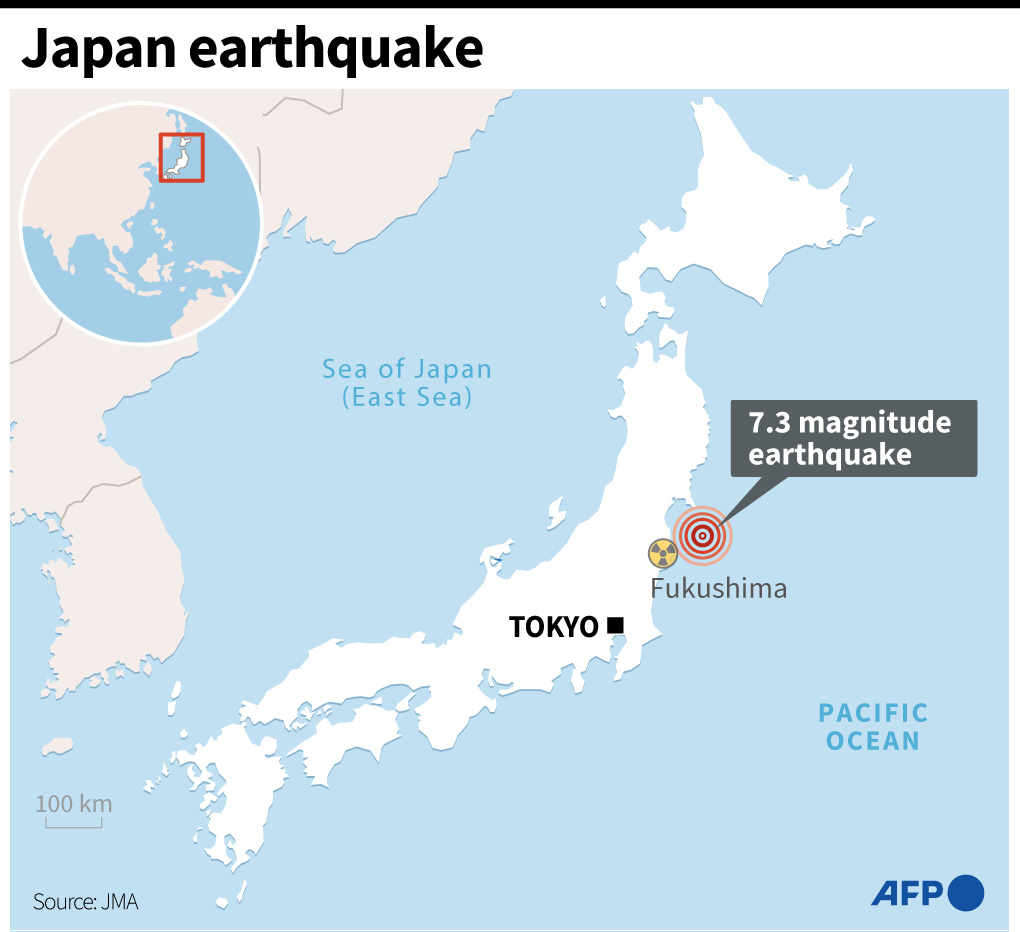 Japan’s meteorological agency said the quake hit at 11:08 pm (1408 GMT) at a depth of 60 kilometres (37 miles) in the Pacific off Fukushima — near the epicentre of the 2011 killer quake which triggered a towering tsunami and killed more than 18,000 people.