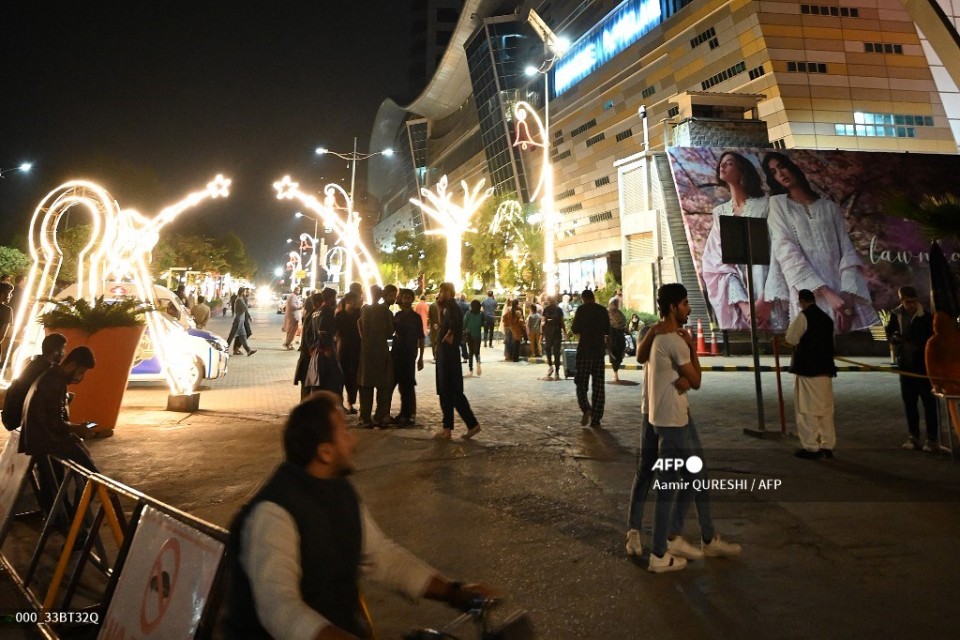 People gather outside a mall following an earthquake in Islamabad, Pakistan, on March 21, 2023. – A strong earthquake lasting for at least 30 seconds was felt across much of Afghanistan, Pakistan and parts of India, with the United States Geological Survey putting the magnitude at 6.5. (Photo by Aamir QURESHI / AFP)