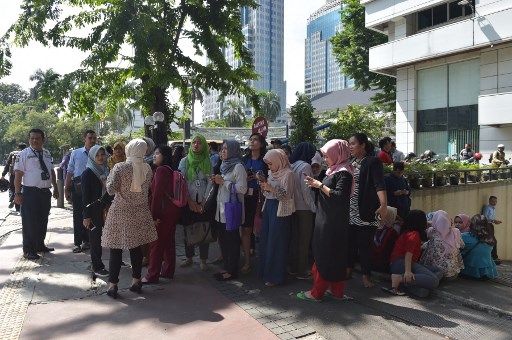 Indonesia’s capital Jakarta was rocked by a strong earthquake on January 23, forcing the evacuation of office buildings but there was no immediate threat of a tsunami or reports of injuries, a government agency said. / AFP PHOTO / ADEK BERRY