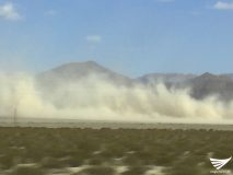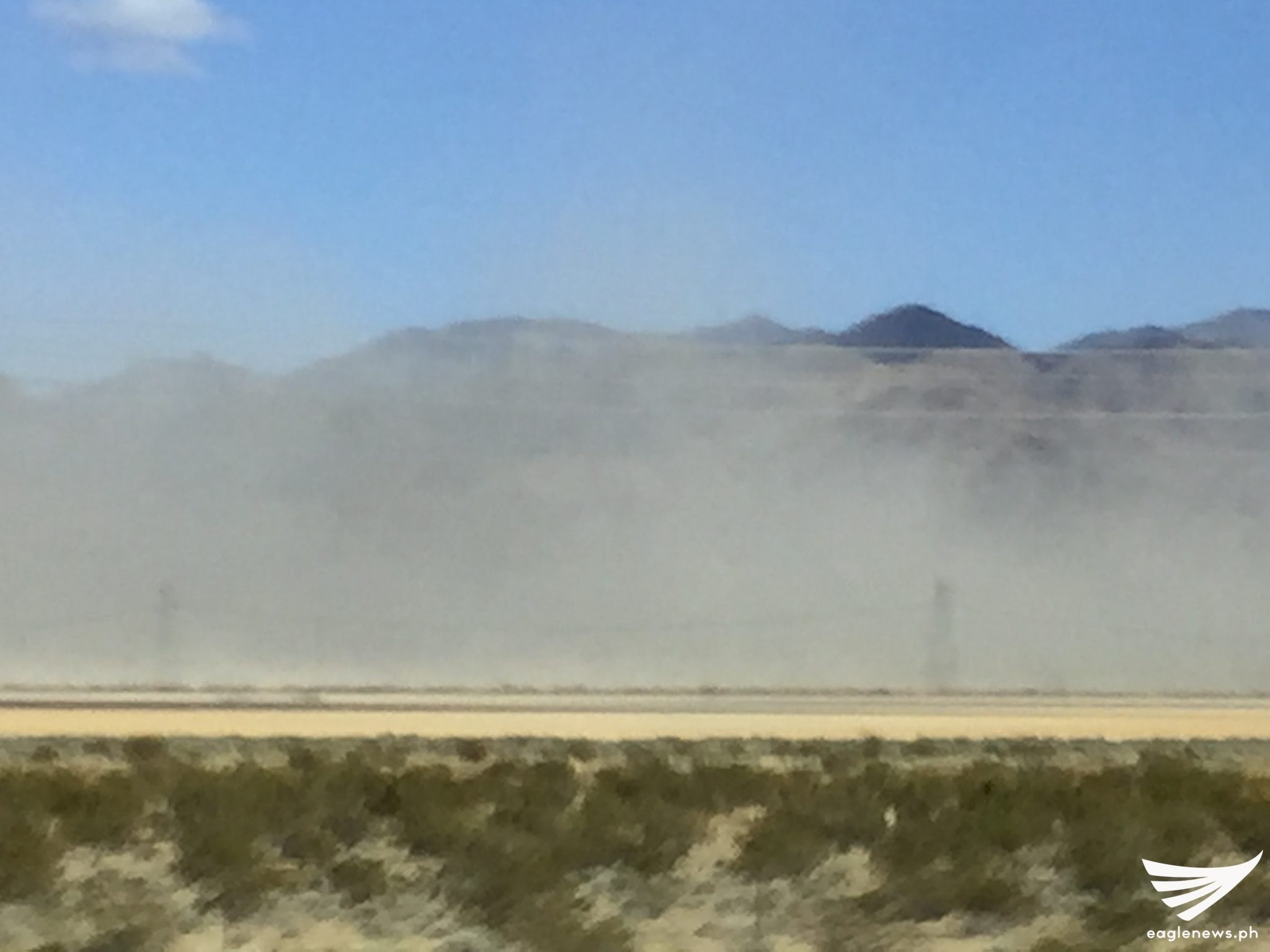 Motorists traveling back to California, from Las Vegas, experienced 25 to 40 mph winds with gusts up to 60 mph. Visibility was reduced in some areas due to the blowing sand and dust, creating larger sand clouds in the distance.