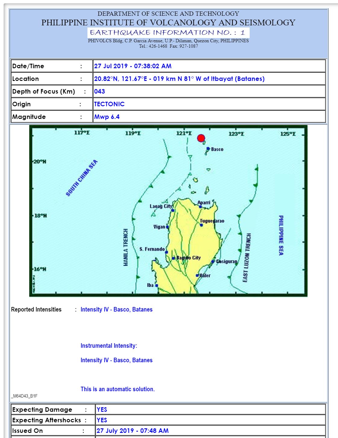 (Eagle News) – A magnitude 6.4 quake shook Itbayat, Batanes on Saturday morning, July 27, about three hours after another quake of a slightly lower magnitude struck the area.