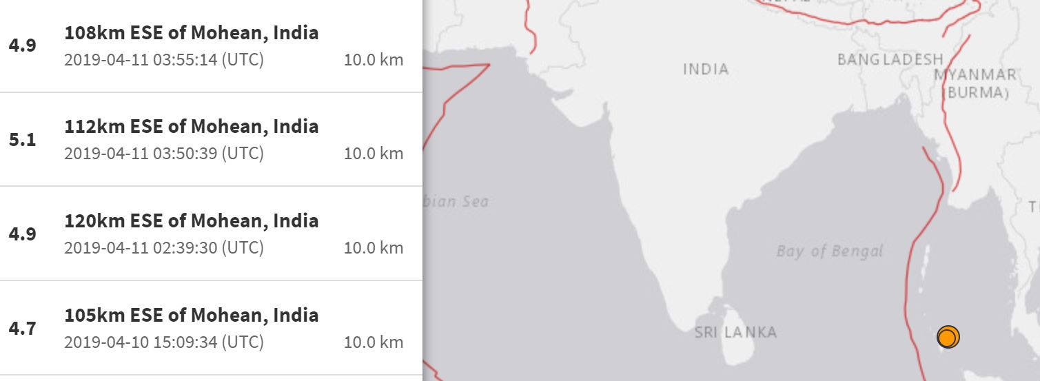 The quakes were located more than a hundred kilometers east southeast of Mohean, India or near Nicobar Islands between 15:09 UTC time or 11:09 p.m. Wednesday, April 10, until 3:55 p.m. UTC time or 11:55 a.m. Thursday, April 11 Philippine time.