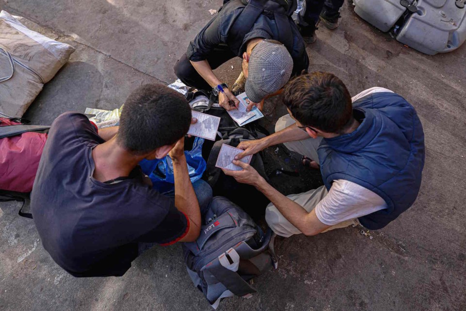Passengers fleeing war-torn Sudan fill up a paper upon their arrival at Qastal Lan Port crossing between Egypt and Sudan on May 13, 2023. Air strikes pummelled Khartoum, with representatives of Sudan’s warring factions meeting in Saudi Arabia for talks to prevent a “humanitarian catastrophe” as the fighting entered a fifth week. (Photo by Khaled DESOUKI / AFP)