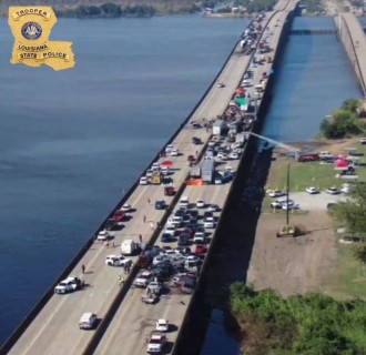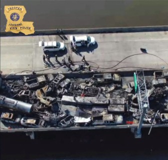 TOPSHOT – This still image obtained from a handout video released by the Lousiana State Police on Facebook shows cars piled up after a crash on Interstate 55 highway in St. John the Baptist Parish, Louisiana, on October 23, 2023. A large cloud of fog enveloping a highway led to at least 158 car crashes and seven deaths in the southern US state of Louisiana, authorities said. The so-called “super fog,” which US media reported was caused by a mixture of marsh fires and dense fog, led to a massive pileup on Interstate 55, about 30 miles (48 kilometers) outside of New Orleans, the Louisiana State Police said in a statement. (Photo by Louisiana State Police / AFP)