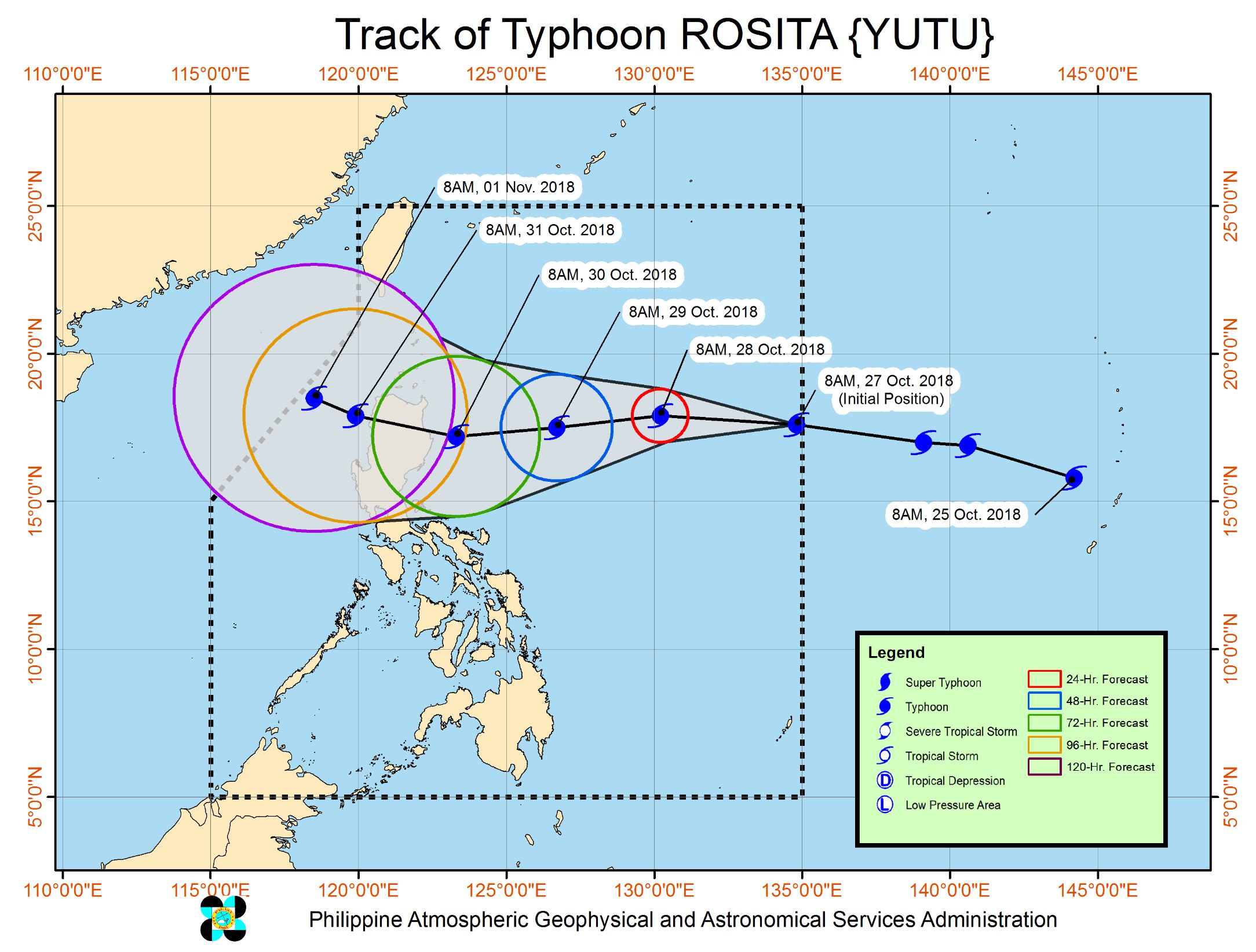 As of 10 a.m. Saturday, October 27, “Rosita” was located at 1,345 km East of Aparri, Cagayan (17.6 °N, 134.3 °E ), moving west at 20 kilometers per hour.