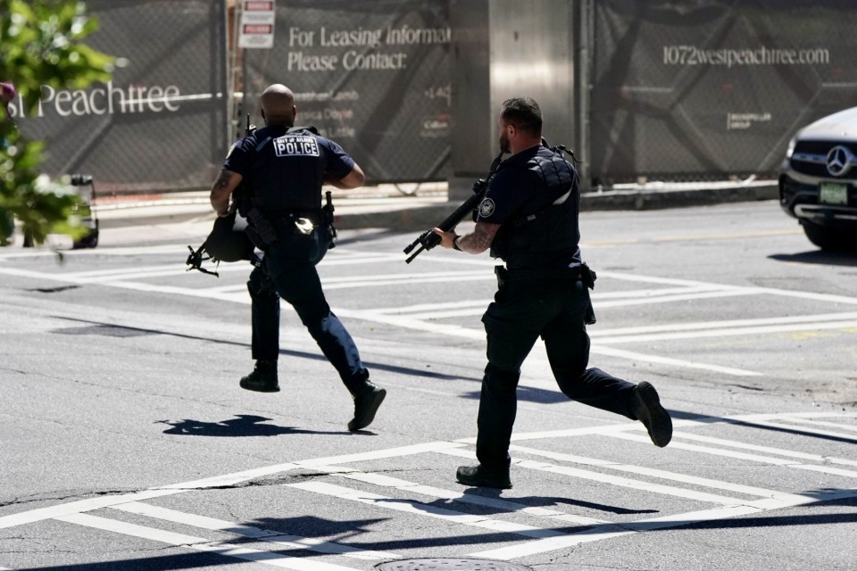Police officers rush to the area after a man shot five people in a building in Atlanta, Georgia, on May 3, 2023. (Photo by Elijah NOUVELAGE / AFP)