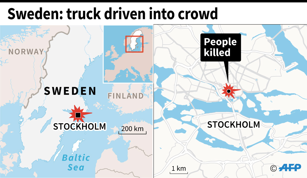 STOCKHOLM, Sweden (AFP) — Four people were killed and at least 15 injured when a stolen truck slammed into a crowd of people outside a busy department store in central Stockholm, in what the prime minister described as a “terror attack.”