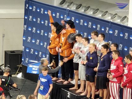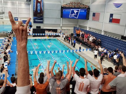 AUSTIN, Texas (Eagle News) – Defending National Champions and host Texas Longhorns started Day 1 of the NCAA Division I Swimming and Diving Championships on a record-breaking high at the Lee and Joe Jamail Texas Swimming Center in Austin.